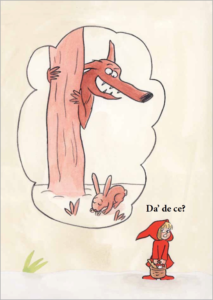 „Dis-de-dimineață, Scufița Roșie pornește spre bunica ei… Când, deodată, un lup mare și rău se repede la ea.